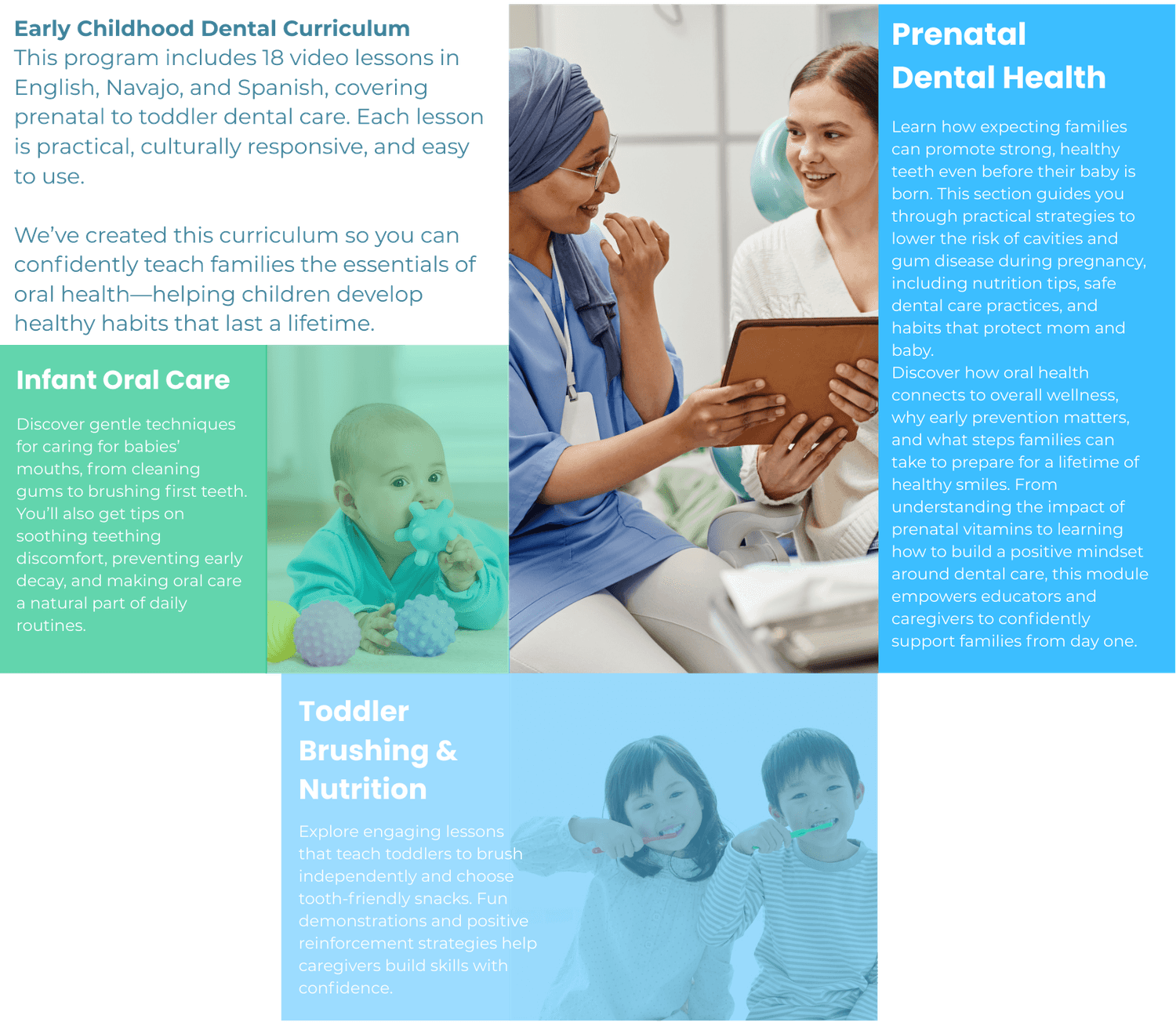 This program includes 18 video lessons in English, Navajo, and Spanish, covering prenatal to toddler dental care. Each lesson is practical, culturally responsive, and easy to use.
